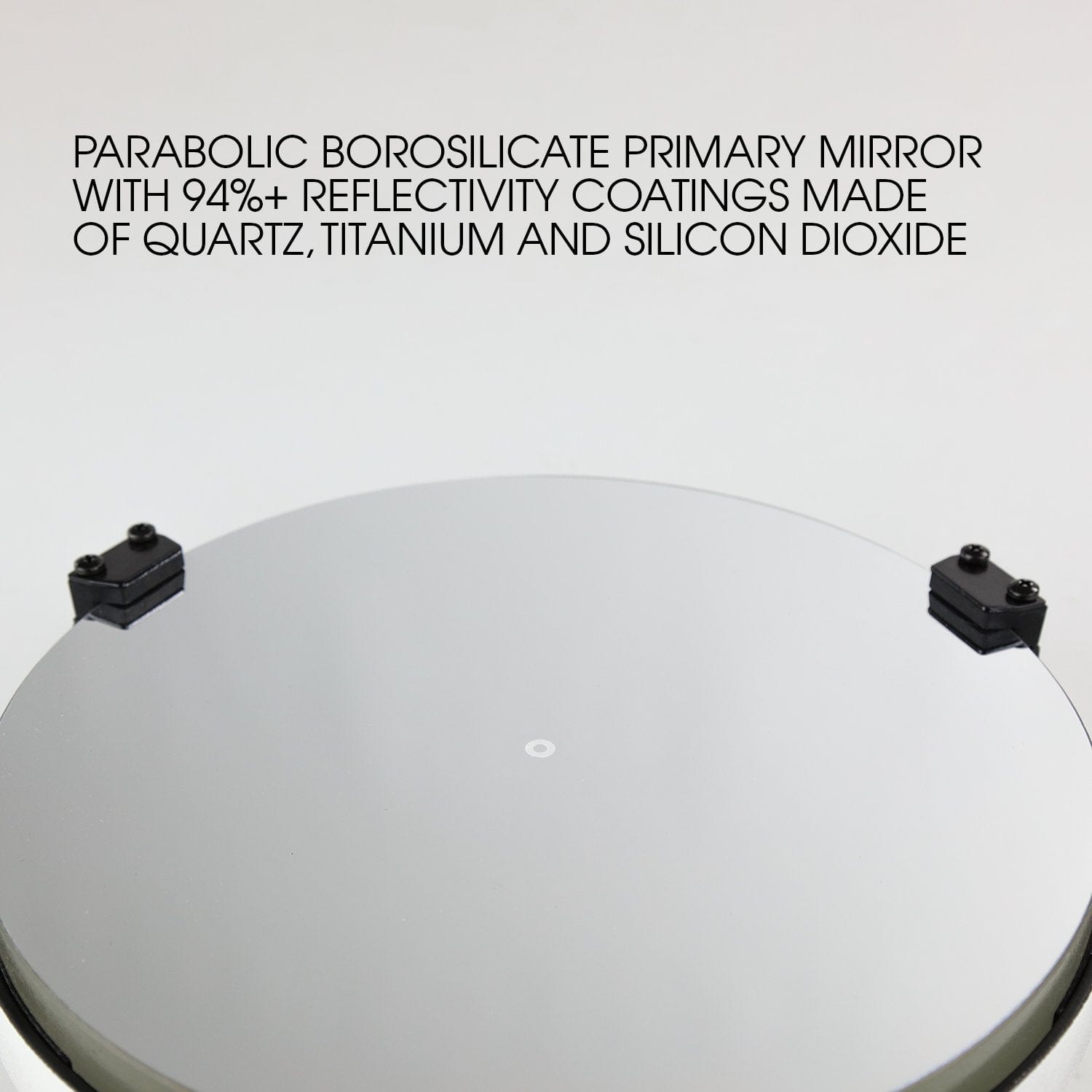 Le Sky-Watcher 10" DOB utilise des composants de qualité. La fierté du travail se manifeste dans les normes de qualité élevées de fabrication optique et mécanique. Le processus de polissage du miroir primaire et diagonal produit des surfaces de miroir lisses assurant un bon contraste, et l'optique correctement corrigée montre des altérations minimales du front d'onde optique. Sur chaque miroir primaire parabolique et miroir diagonal elliptique, de l'aluminium est déposé sous vide sur la surface avant en verre, puis recouvert de quartz dur (SiO4). Des couches supplémentaires de dioxyde de titane (TiO2) et (SiO4) sont ensuite appliquées. Les composants mécaniques et structurels de l'OTA présentent une construction rigide et une stabilité exceptionnelle. La construction de la monture est robuste et rigide. La conception de la monture, bien que simple, facilite les mouvements fluides autour des deux axes. Des accessoires de qualité améliorent l'expérience de visualisation de l'observateur.