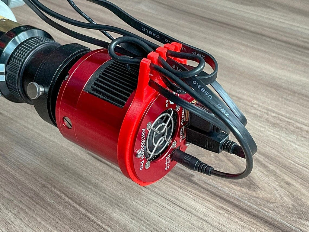 L'organiseur de câbles est doté de deux clips de 6,5 mm et de deux clips de 4,5 mm, un de chaque côté, ainsi que de deux canaux plus fins pour les câbles de type ruban. L'anneau se glisse autour du corps de l'appareil photo et est maintenu en place par pression, grâce à une conception flexible.