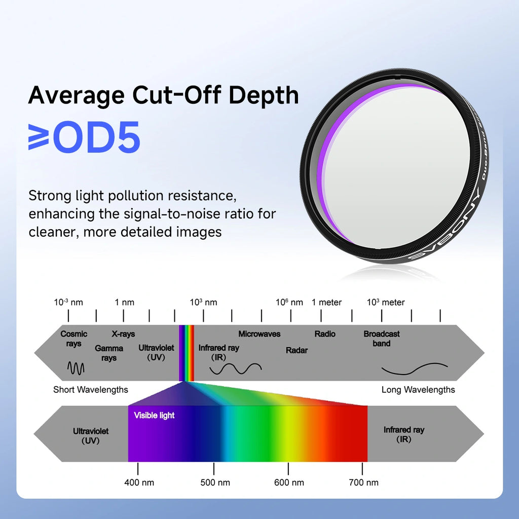 - Filtre à bande étroite double H-Alpha/O-III 7 nm, conçu spécifiquement pour l'astrophotographie, même en milieu pollué par la lumière.