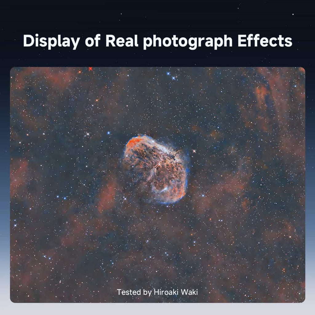 - Filtre à bande étroite double H-Alpha/O-III 7 nm, conçu spécifiquement pour l'astrophotographie, même en milieu pollué par la lumière.