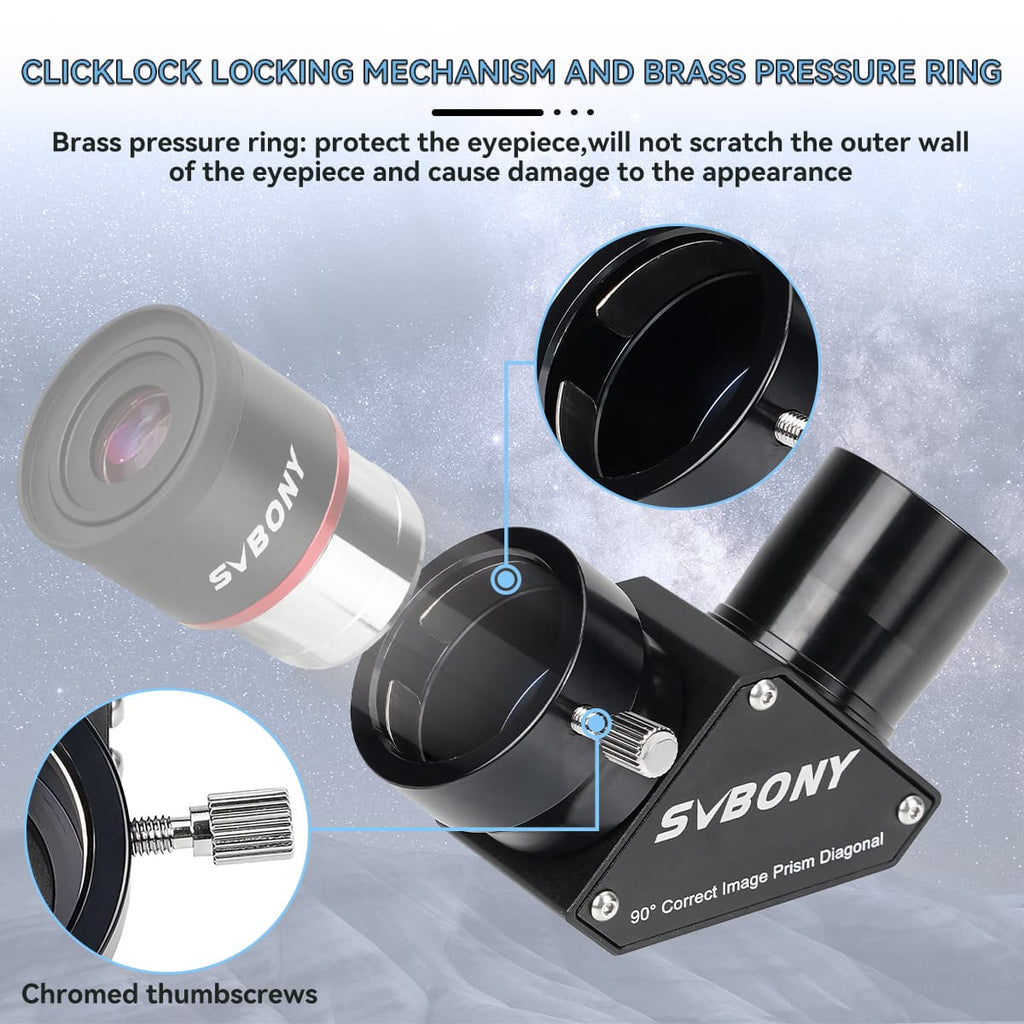 Le prisme redresseur à 45 degrés de haute qualité SVBONY SV222 de 1,25 pouce avec revêtements de phase permet un bon contraste et des images lumineuses. Conçu avec un porte-oculaire entièrement en aluminium anodisé noir, de grandes vis à oreilles chromées et un intérieur noirci et déflecteur pour éviter les reflets de lumière parasite internes. Le porte-oculaire de 1,25" est livré avec une bague de compression en laiton anti-rayures. Le SV222 accepte les oculaires de 1,25", s'adapte aux focalisateurs de 1,25". Adapté à une utilisation terrestre ou astronomique, cette diagonale produit une image à l'endroit, non inversée avec une orientation diurne correcte.