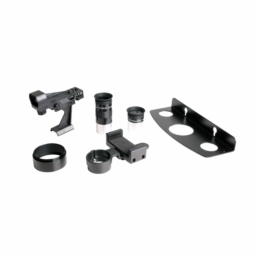- Additional accessories include a red dot finder scope for locating objects in the night sky and a smartphone adapter to aid in simple astrophotography