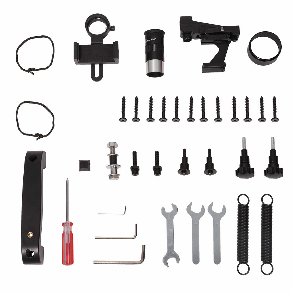 • Included accessories are a red-dot finder scope for locating objects in the night sky, a smartphone adapter to aid in simple astrophotography and a dust cover to minimize the build-up of dust and fine debris on the mirrors when in transit or storage